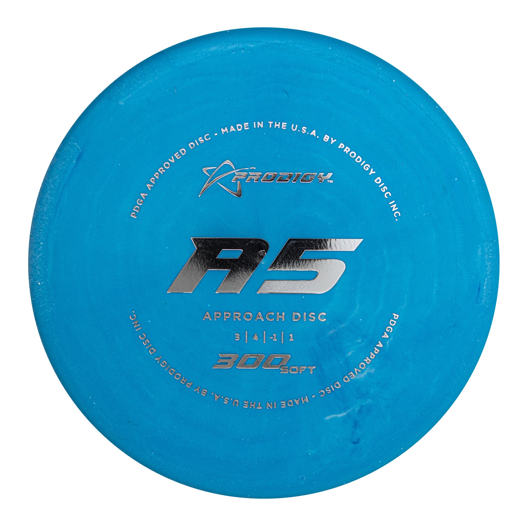 The Prodigy A5 is a slightly overstable approach disc that will work in to be a straight flyer. It has a nice, smooth feel with a shallow profile and flat top, which makes it ideal for sidearm approaches. It can handle torque well and has a mild finish on the end, so it won't skip too far from where it lands.