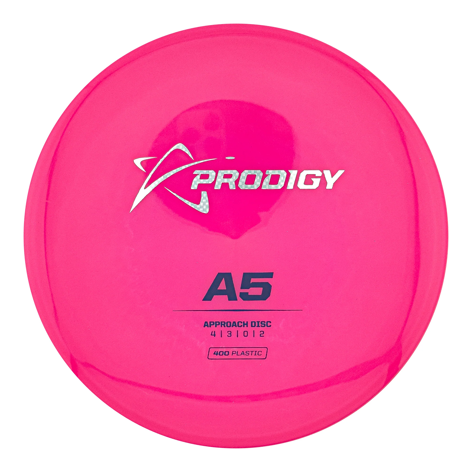 The Prodigy A5 is a slightly overstable approach disc that will work in to be a straight flyer. It has a nice, smooth feel with a shallow profile and flat top, which makes it ideal for sidearm approaches. It can handle torque well and has a mild finish on the end, so it won't skip too far from where it lands.